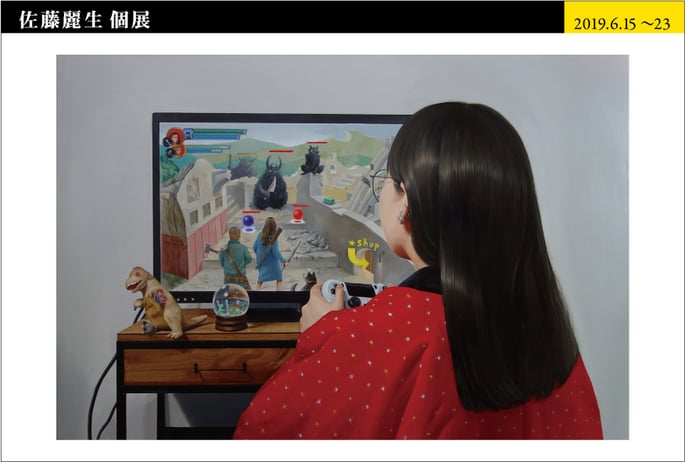 ゲームに耽る人物。その肩越しに見えるのは、複雑に場面設定されたロールプレイングの画面。単なる肖像画とは異なるストーリー性を持たせた人物表現を目指してきたこの作家の新境地が本作に隠されているような気がしてならない。 佐藤美術館 学芸部長 立島 惠