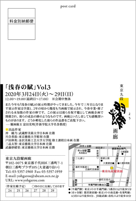 今年で三年目となります展示作家は学部1、2年の頃から幾度も当画廊で展示され、今春卒業・修了される未知数の作家の卵です。